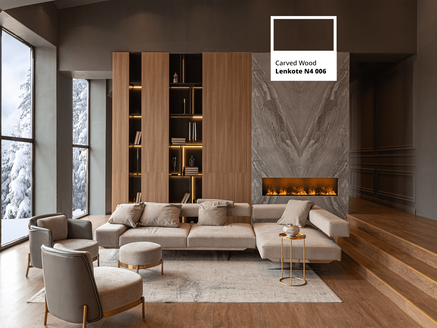 Penekanan aksen kayu pada sudut ruangan dapat memberikan kesan alami pada ruangan, selain itu kamu juga bisa menggunakan aksen kayu sebagai pembatas ruangan atau hiasan pada ruangan sekitar. Sangat sering aksen kayu dipadukan dengan sentuhan marmer sehingga kesan mewah lebih tergambarkan. Kesan mewah juga bisa ditampilkan dengan pemilihan warna emas atau silver pada aksesoris ruangan.