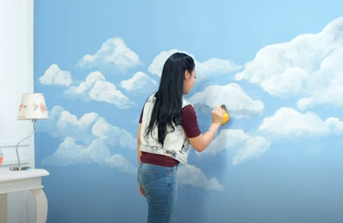 Bagi kamu yang sedang mencari ide kreasi cat tembok untuk kamar anak, cat dinding bercorak seperti ini bisa diterapkan. Motif langit merupakan salah satu jenis motif yang paling sering digunakan untuk dekorasi ruang kamar. Tak perlu repot mengeluarkan biaya lebih untuk membeli wallpaper, dengan washed painting kamu bisa mendapatkan hasil yang menarik.