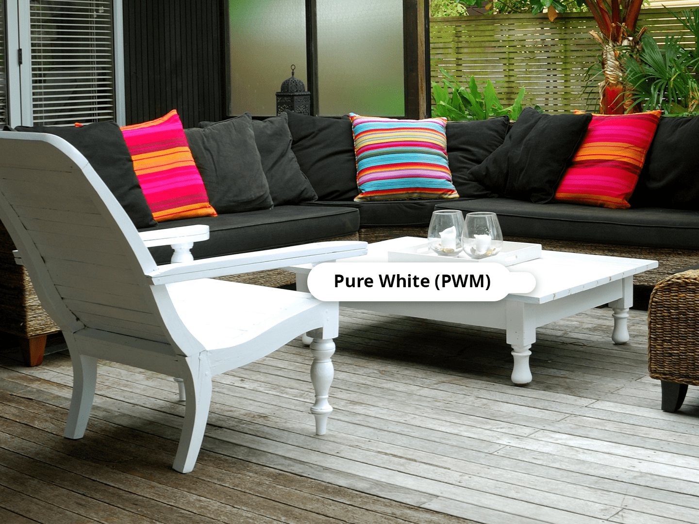 Warna putih yang klasik dan anggun sangat cocok dipadukan dengan dekorasi apapun, termasuk di area luar ruangan. Classic White memberikan tampilan yang bersih, cerah, dan elegan untuk furnitur outdoor di rumah. Warna yang cerah ini juga membantu memantulkan panas matahari, menjaga furnitur tetap sejuk saat digunakan. Dengan pemakaian lapisan cat yang tepat, furnitur kayu putih dapat bertahan lama tanpa memudar atau terkelupas.